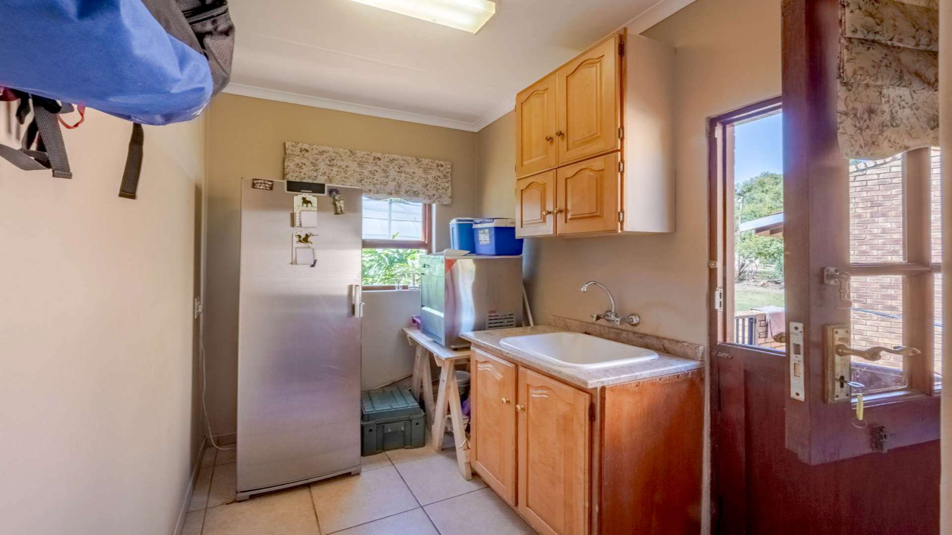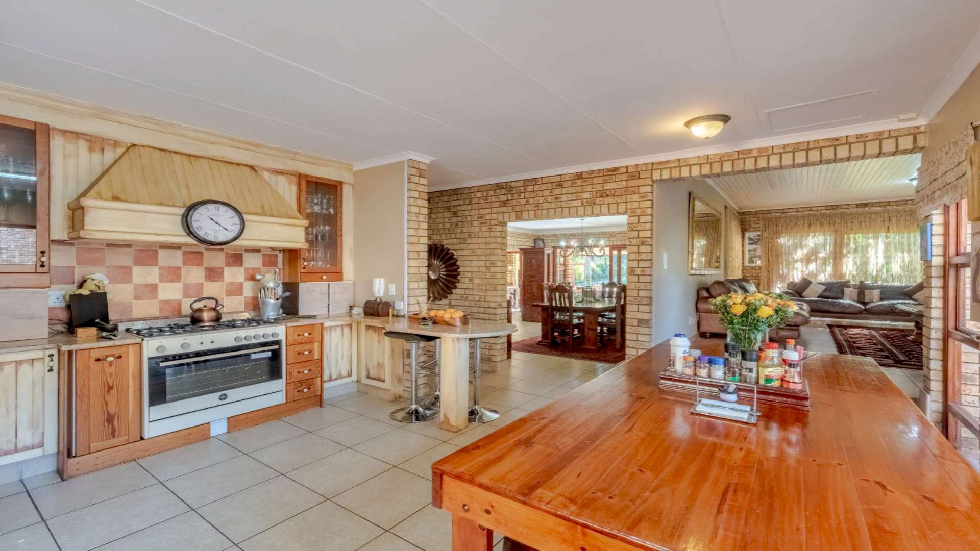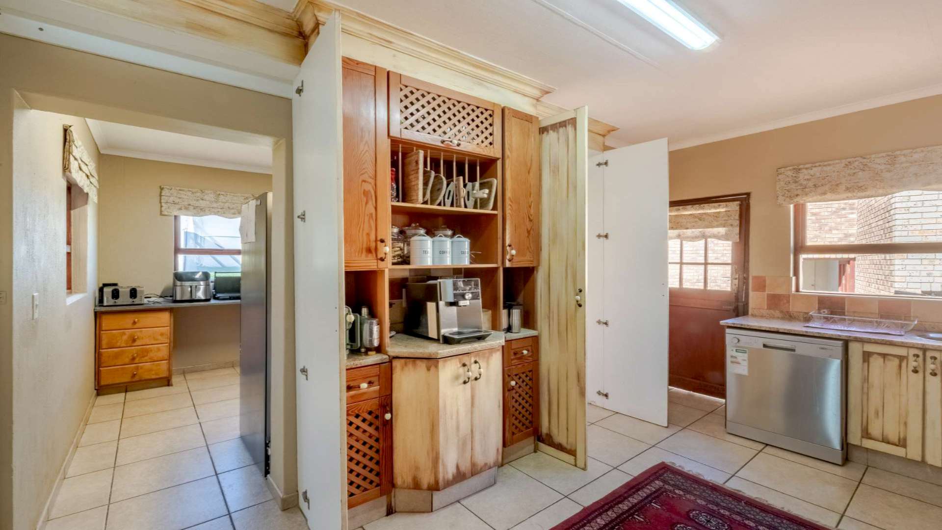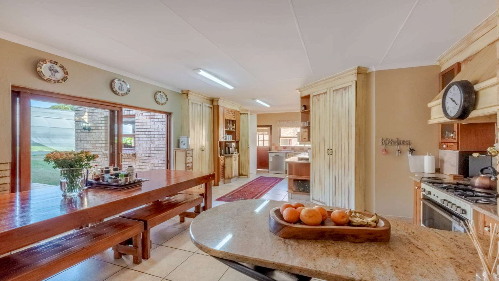The kitchen is a chef’s dream, offering ample cupboard and workspace, a gas stove and hob, large pantry, scullery, and laundry.