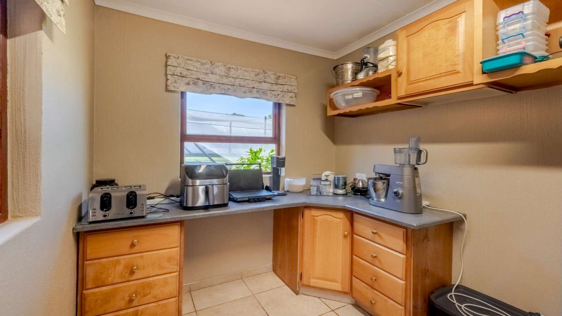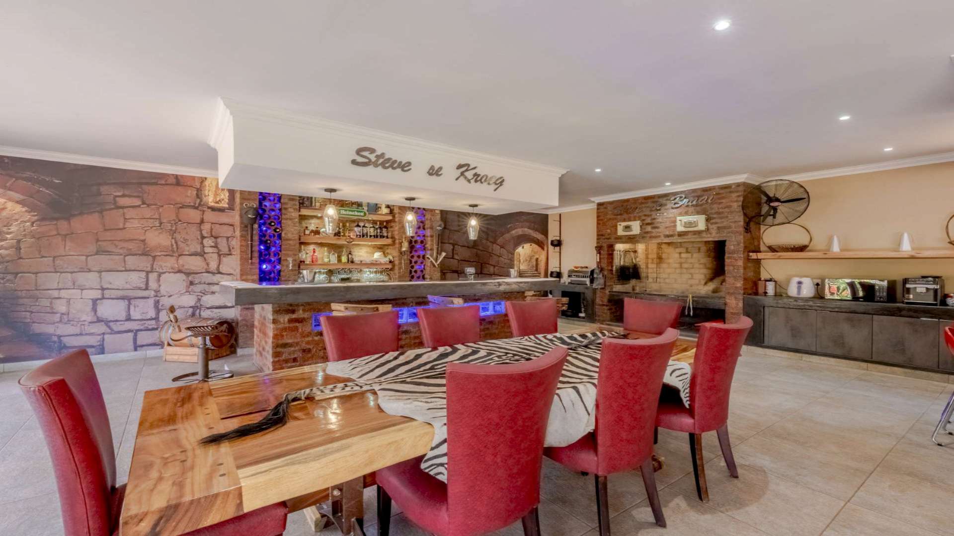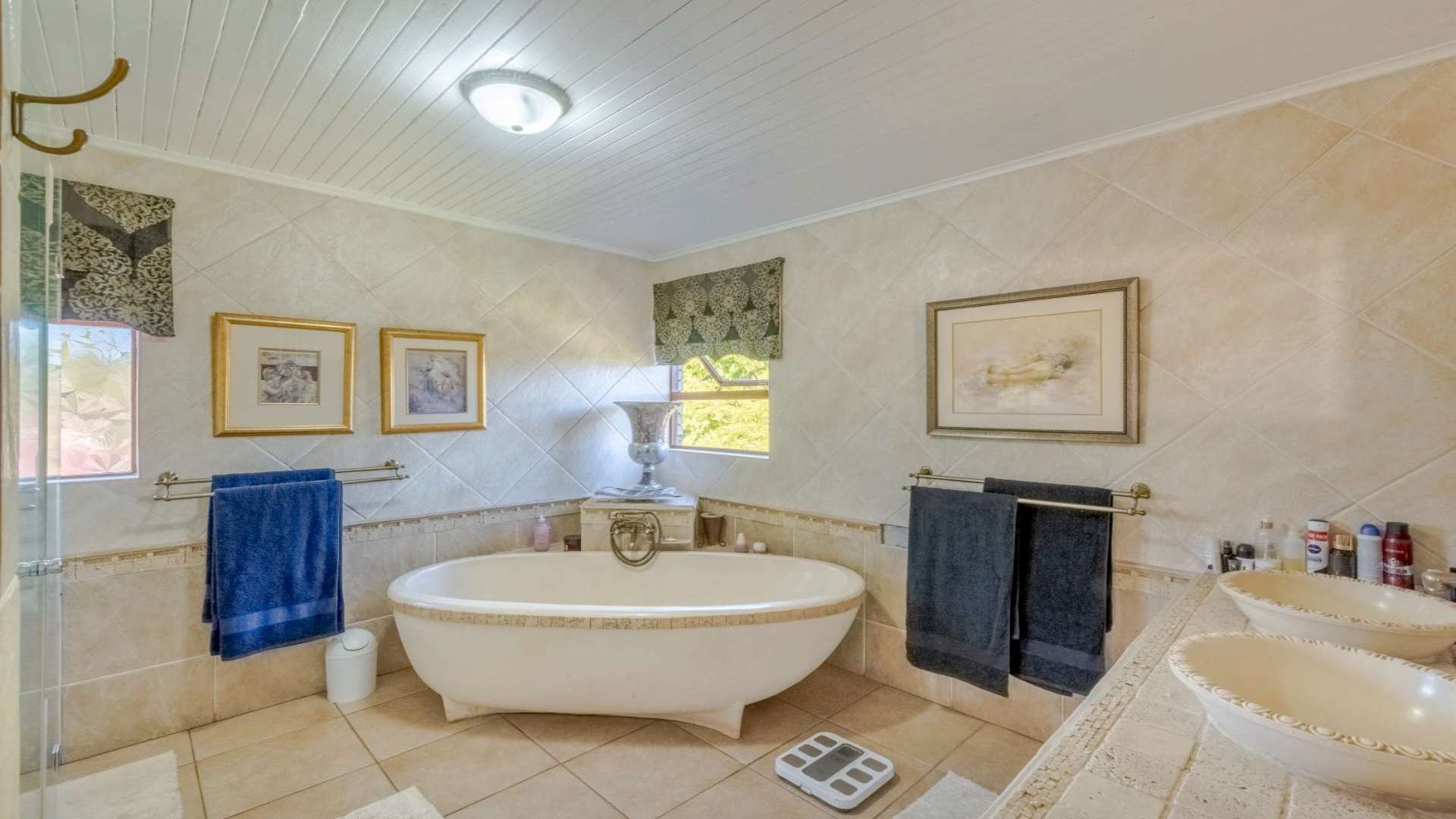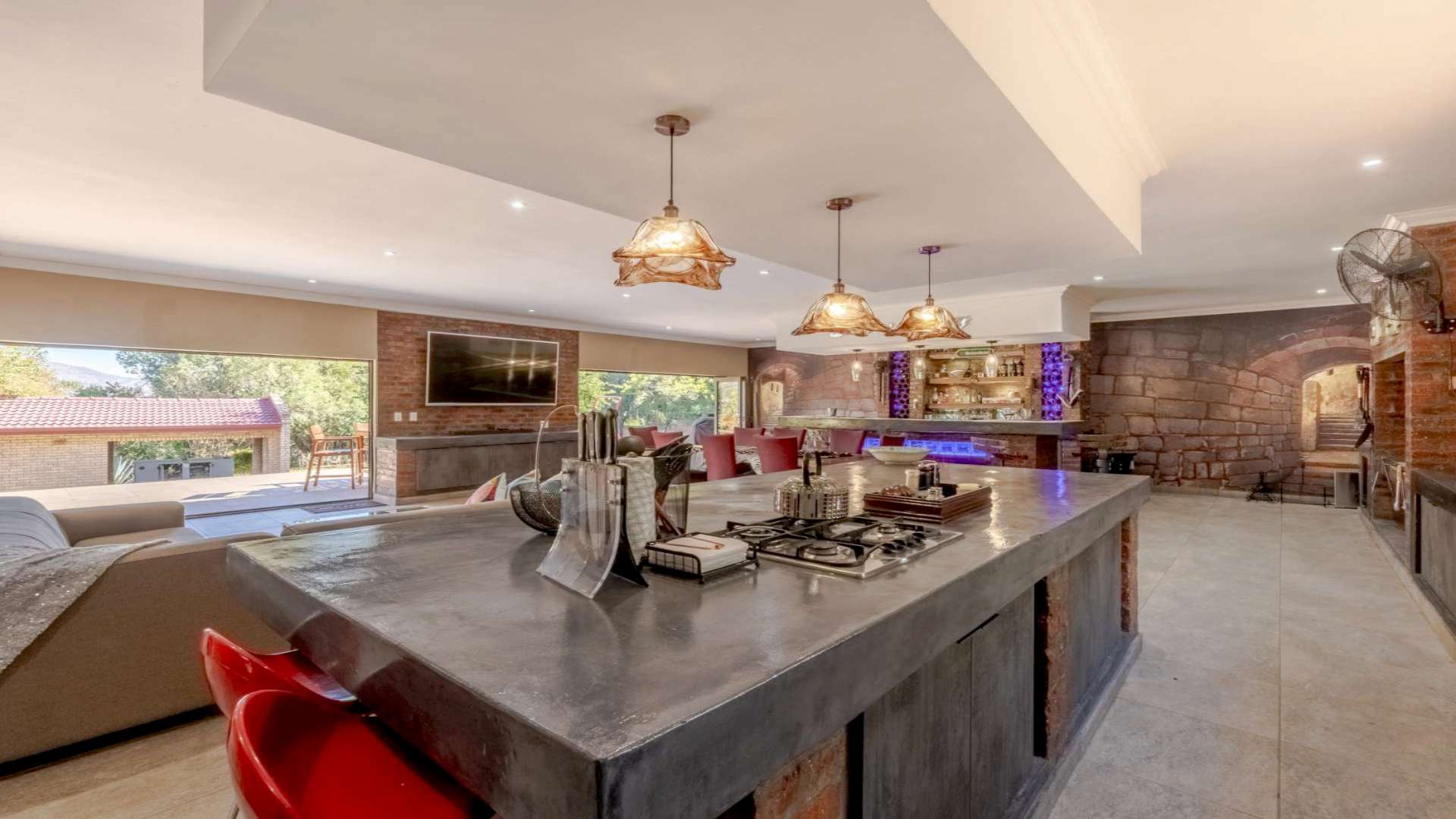 The kitchen is a chef’s dream, offering ample cupboard and workspace, a gas stove and hob, large pantry, scullery, and laundry.