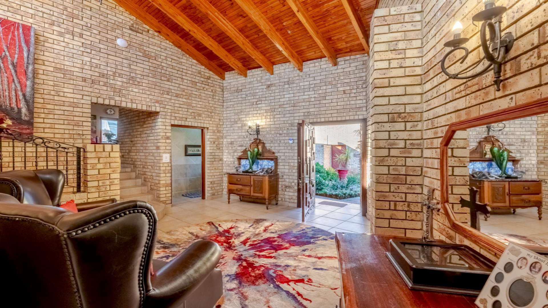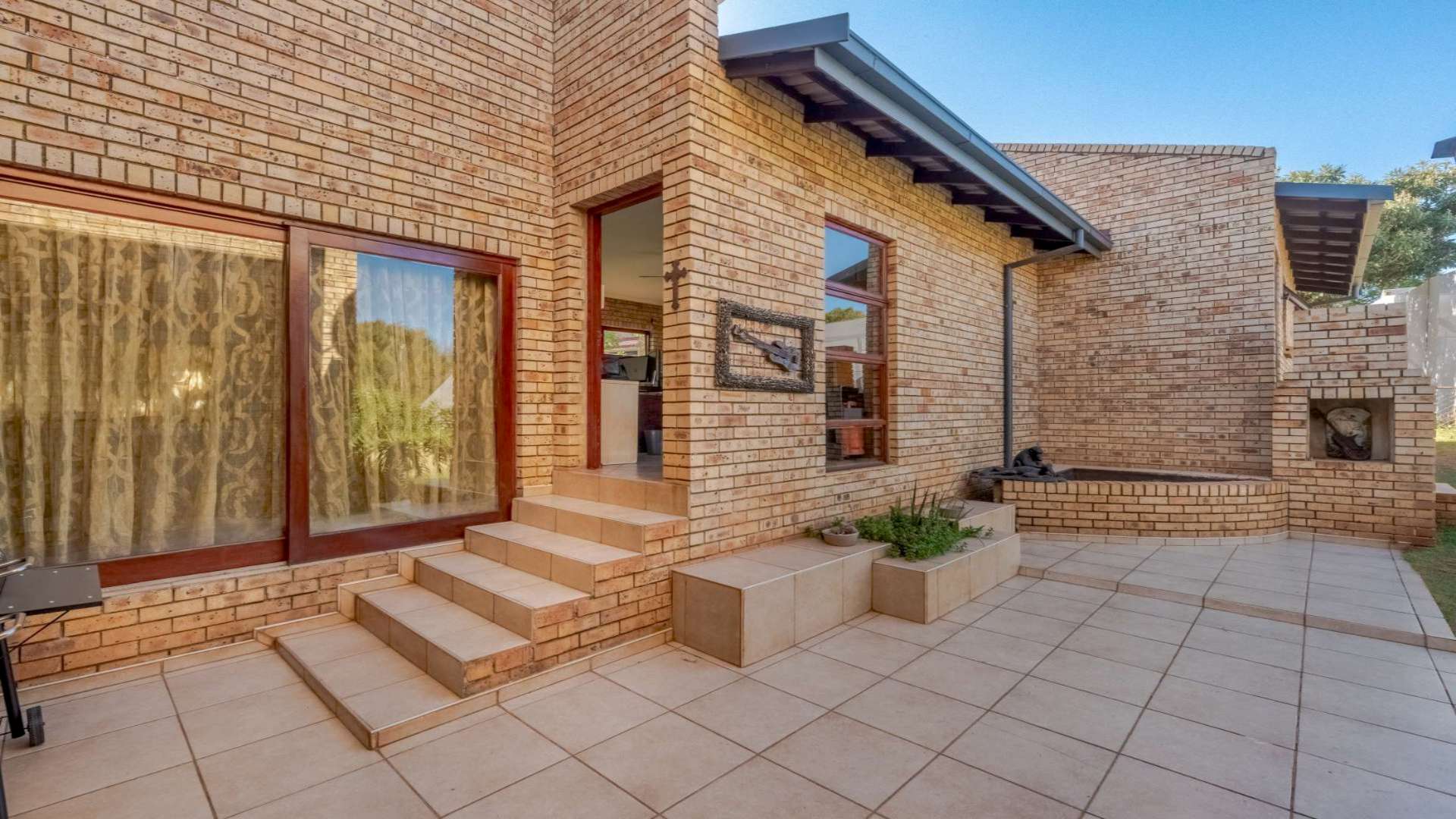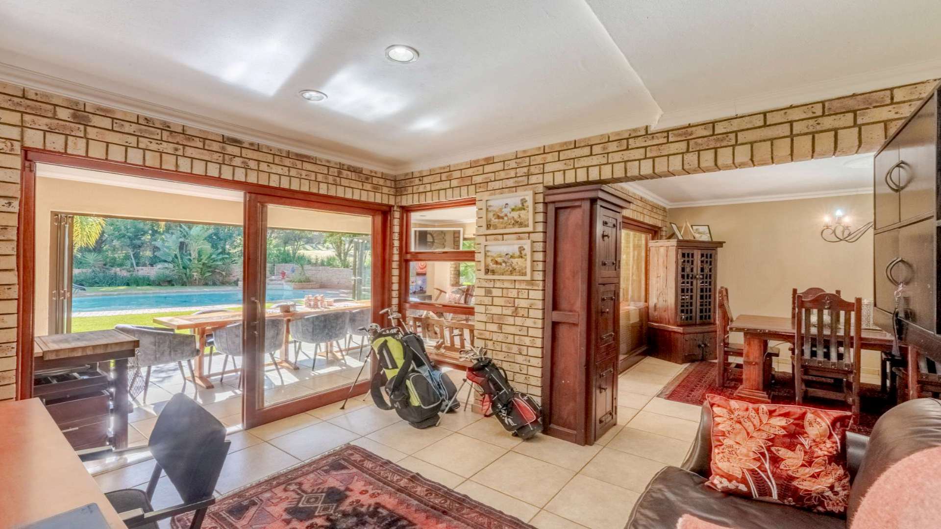 The sophisticated downstairs lounge with a fitted fireplace flows seamlessly into an elegant dining room and family room, all opening onto a covered patio with built-in braai and stack-away doors.