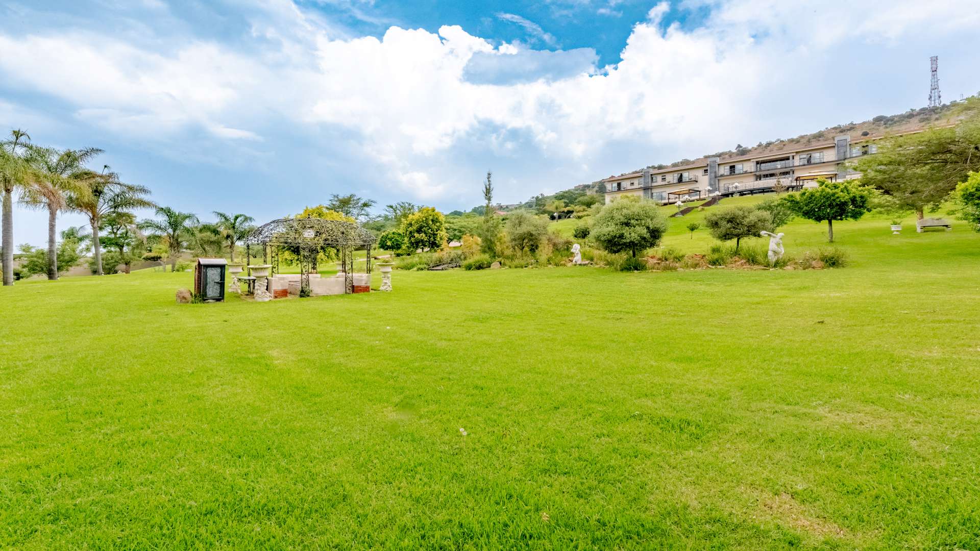 A bespoke wrought iron entrance, masterfully crafted, opens to a meandering, tree-lined driveway that gently ascends toward the residence, revealing glimpses of grandeur along the way.