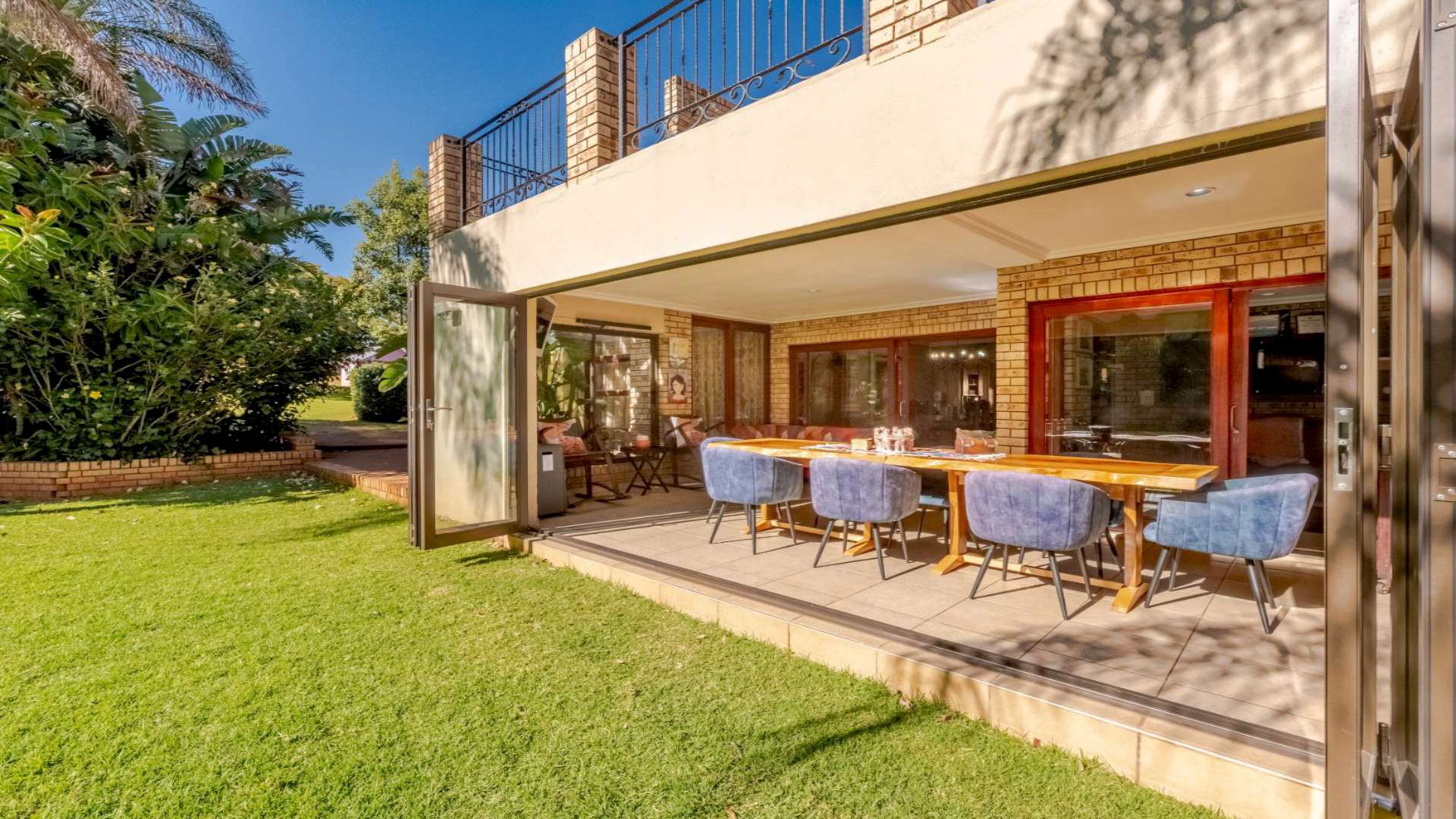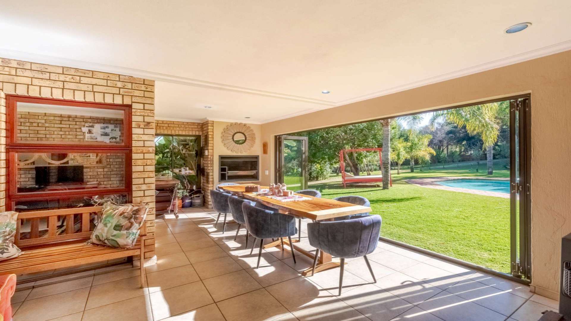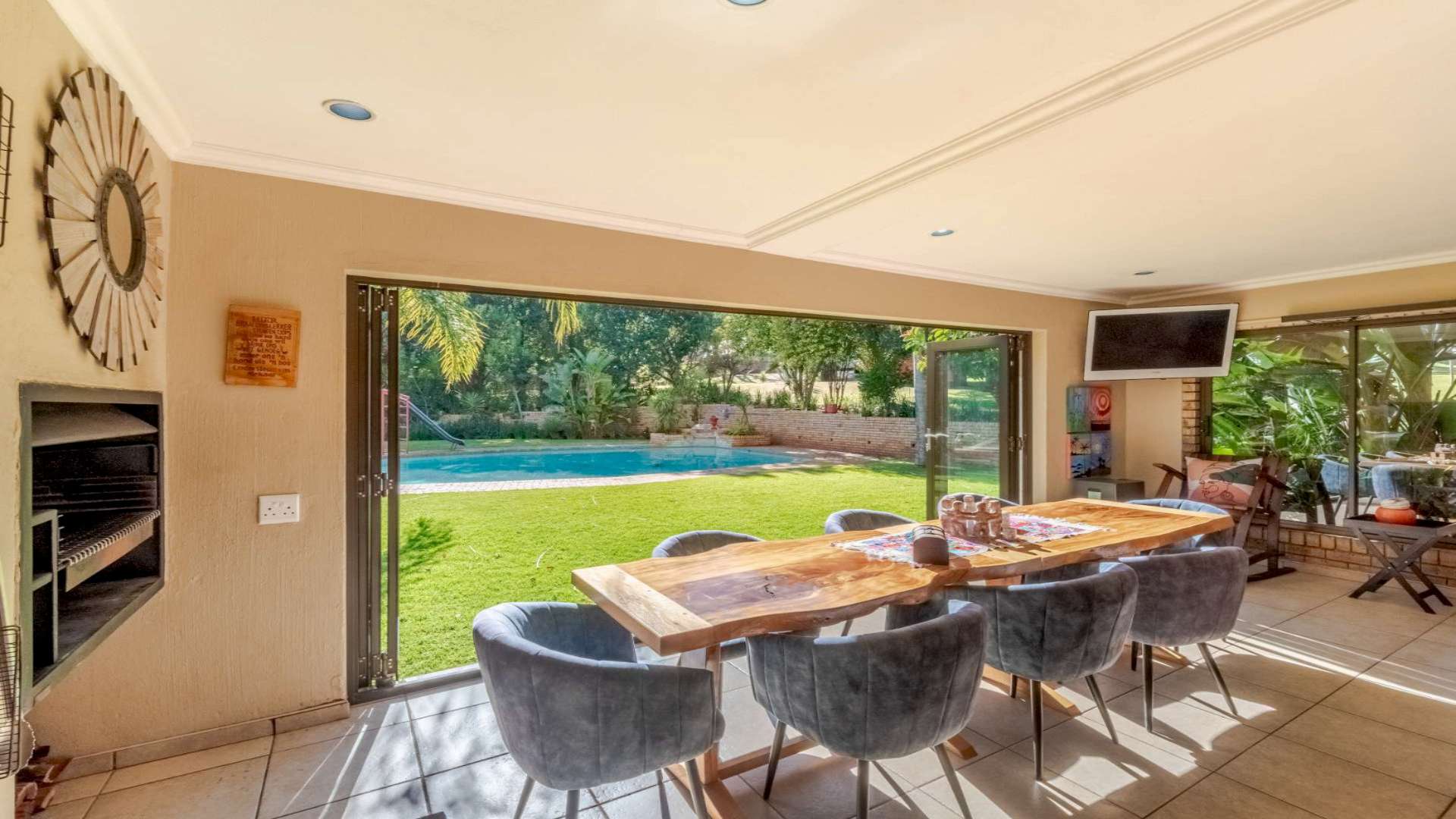 The sophisticated downstairs lounge with a fitted fireplace flows seamlessly into an elegant dining room and family room, all opening onto a covered patio with built-in braai and stack-away doors.