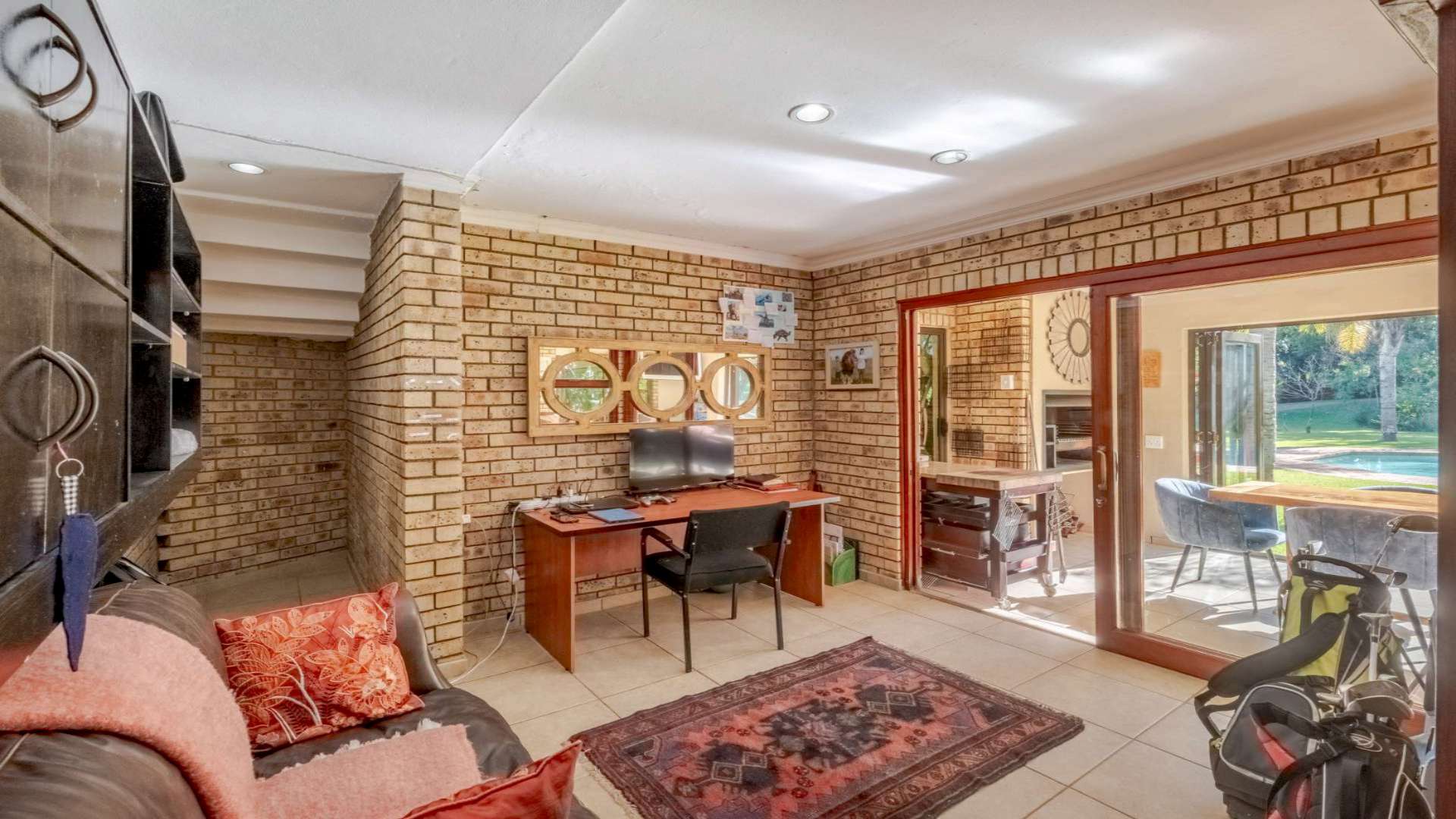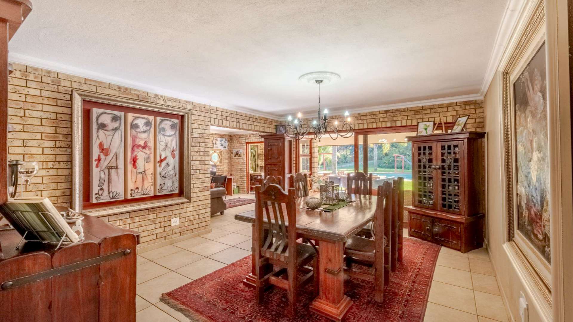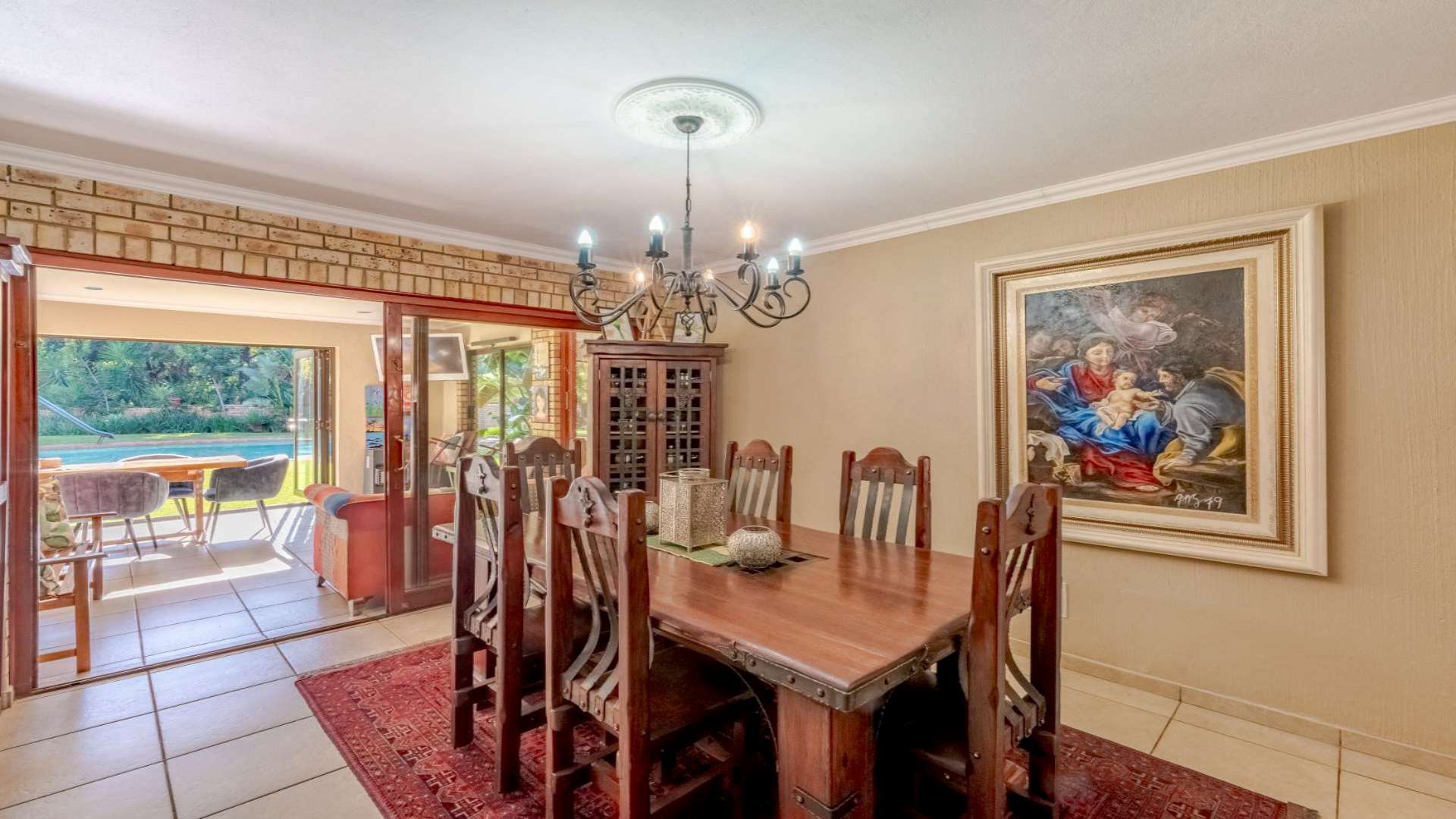 The sophisticated downstairs lounge with a fitted fireplace flows seamlessly into an elegant dining room and family room, all opening onto a covered patio with built-in braai and stack-away doors.