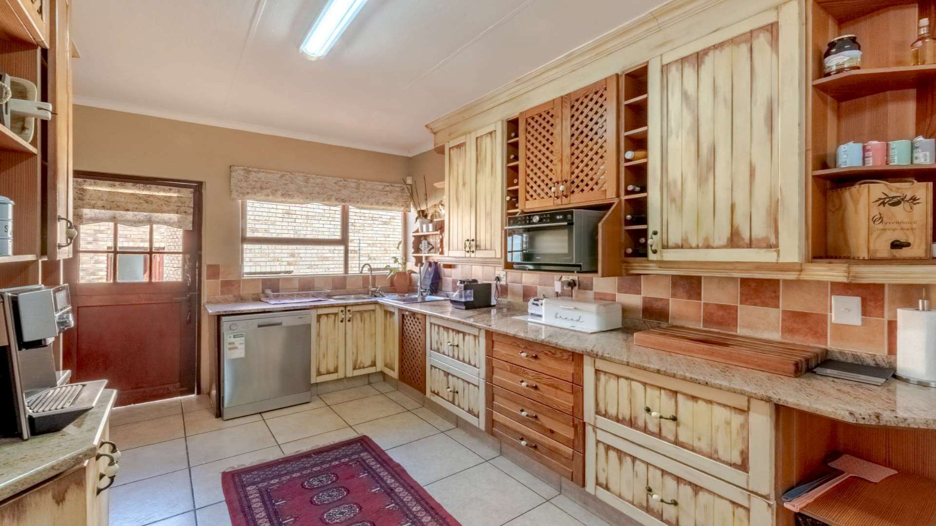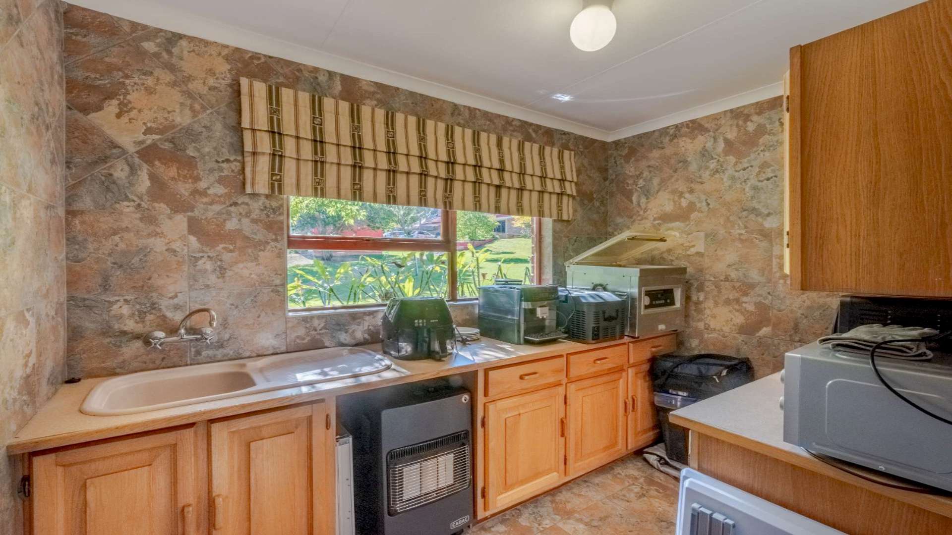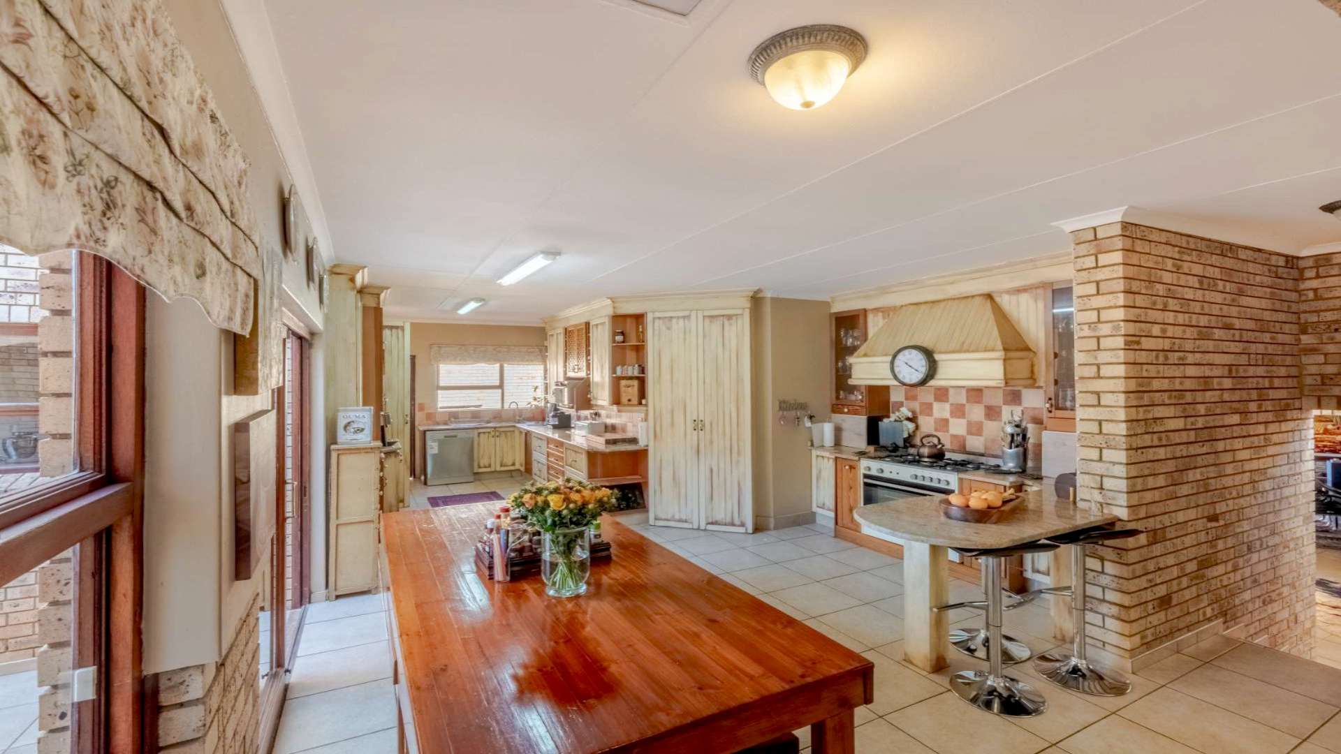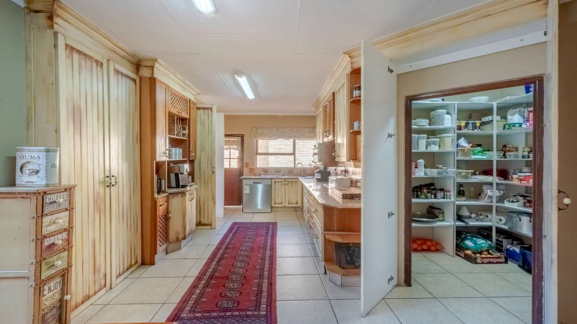 The kitchen is a chef’s dream, offering ample cupboard and workspace, a gas stove and hob, large pantry, scullery, and laundry.