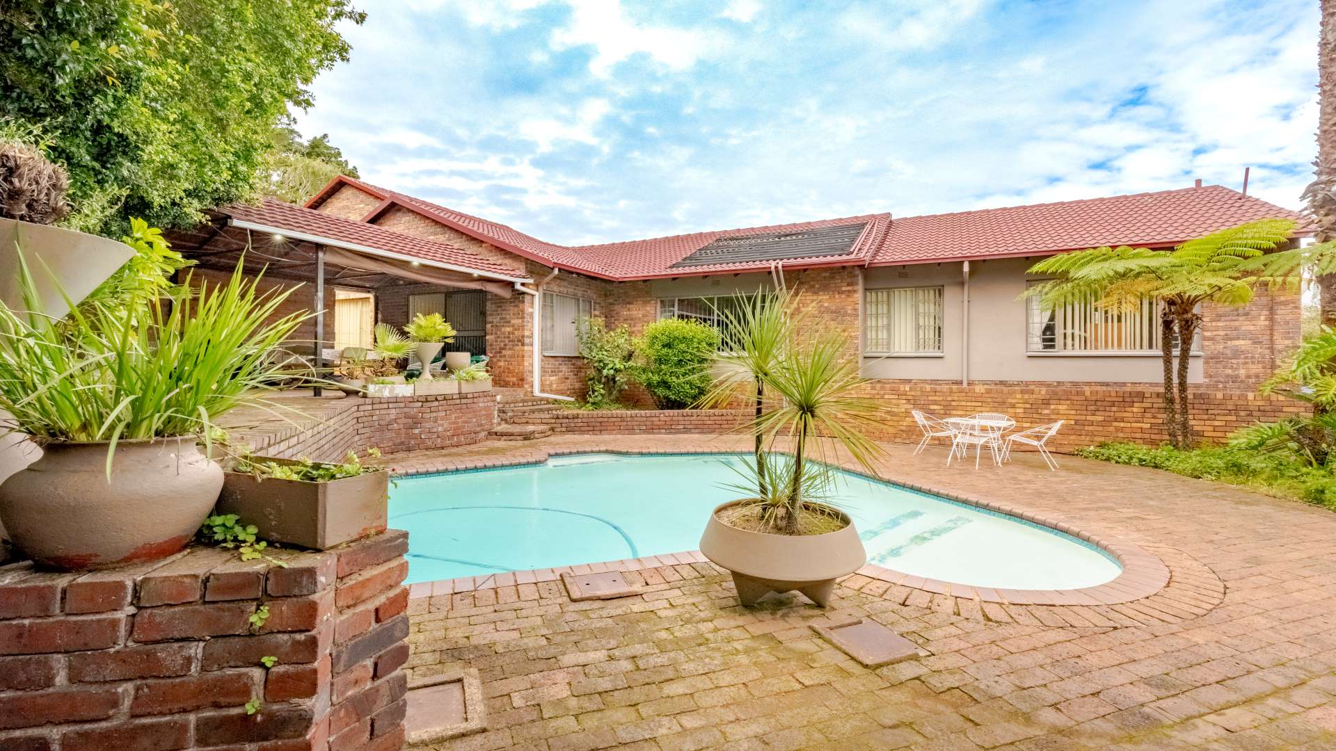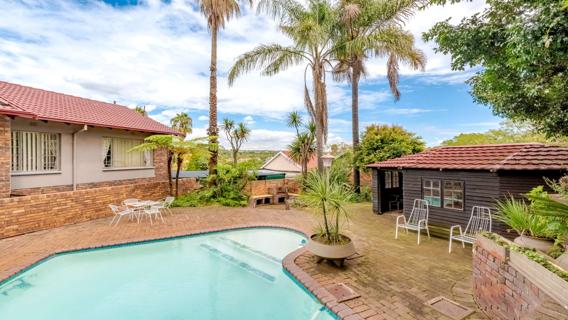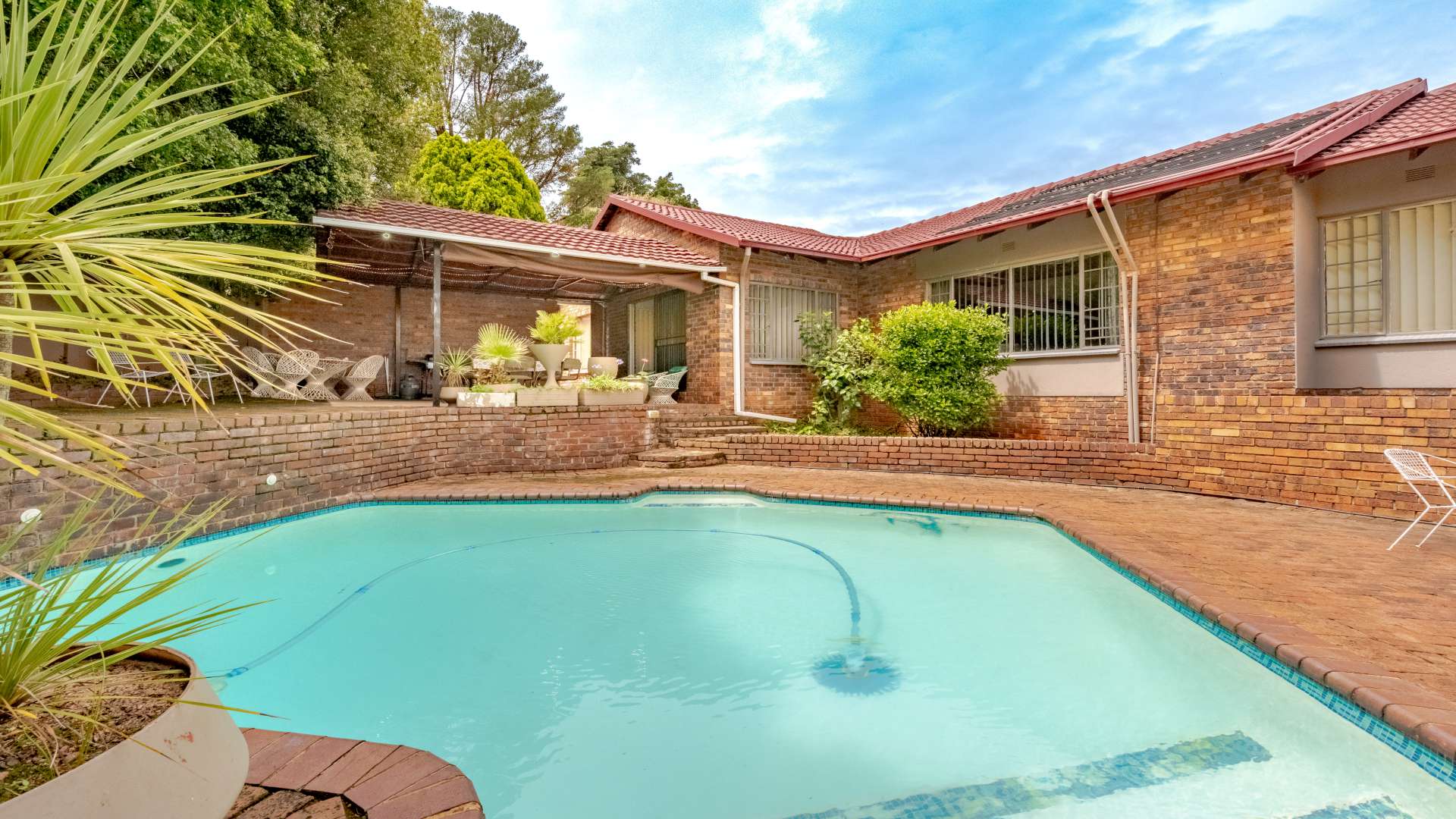 Outdoor living is just as impressive. The property features a heated swimming pool, a jacuzzi set within the lapa, and a unique conversation pit braai area, making it perfect for entertaining friends and family all year round.