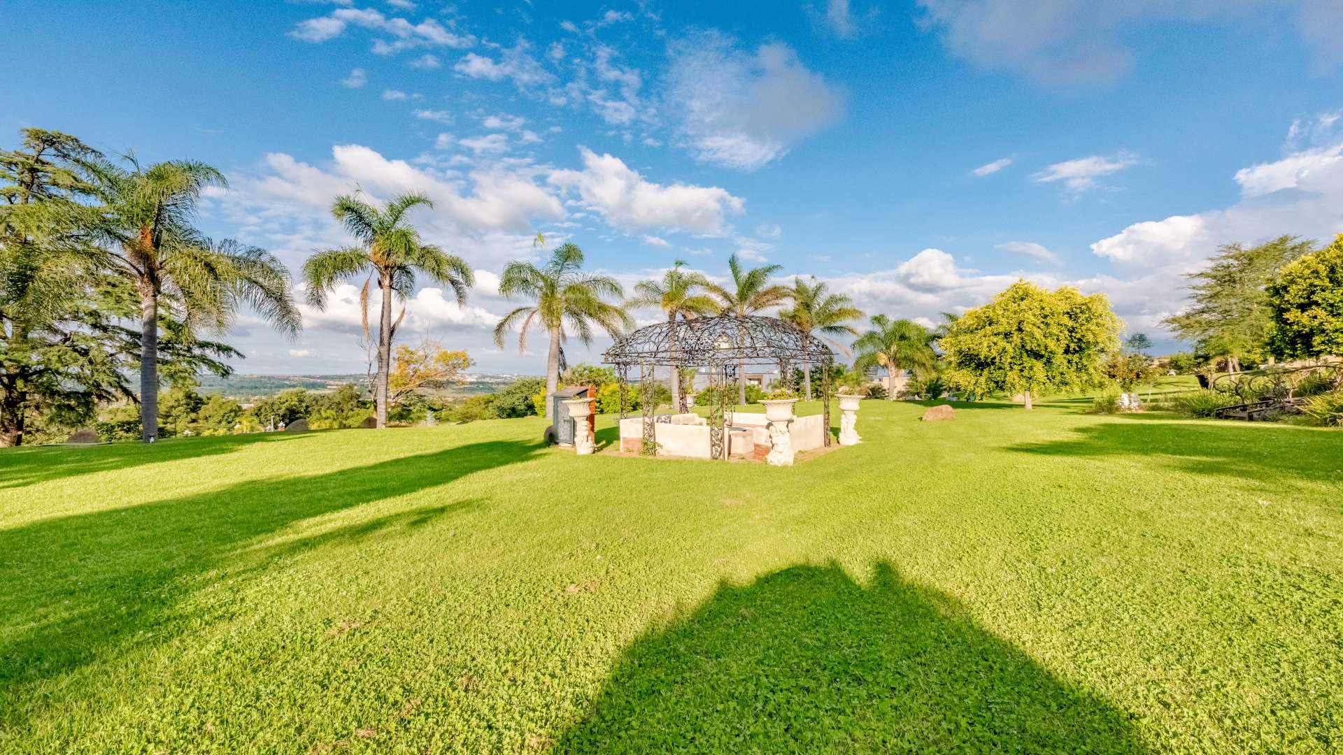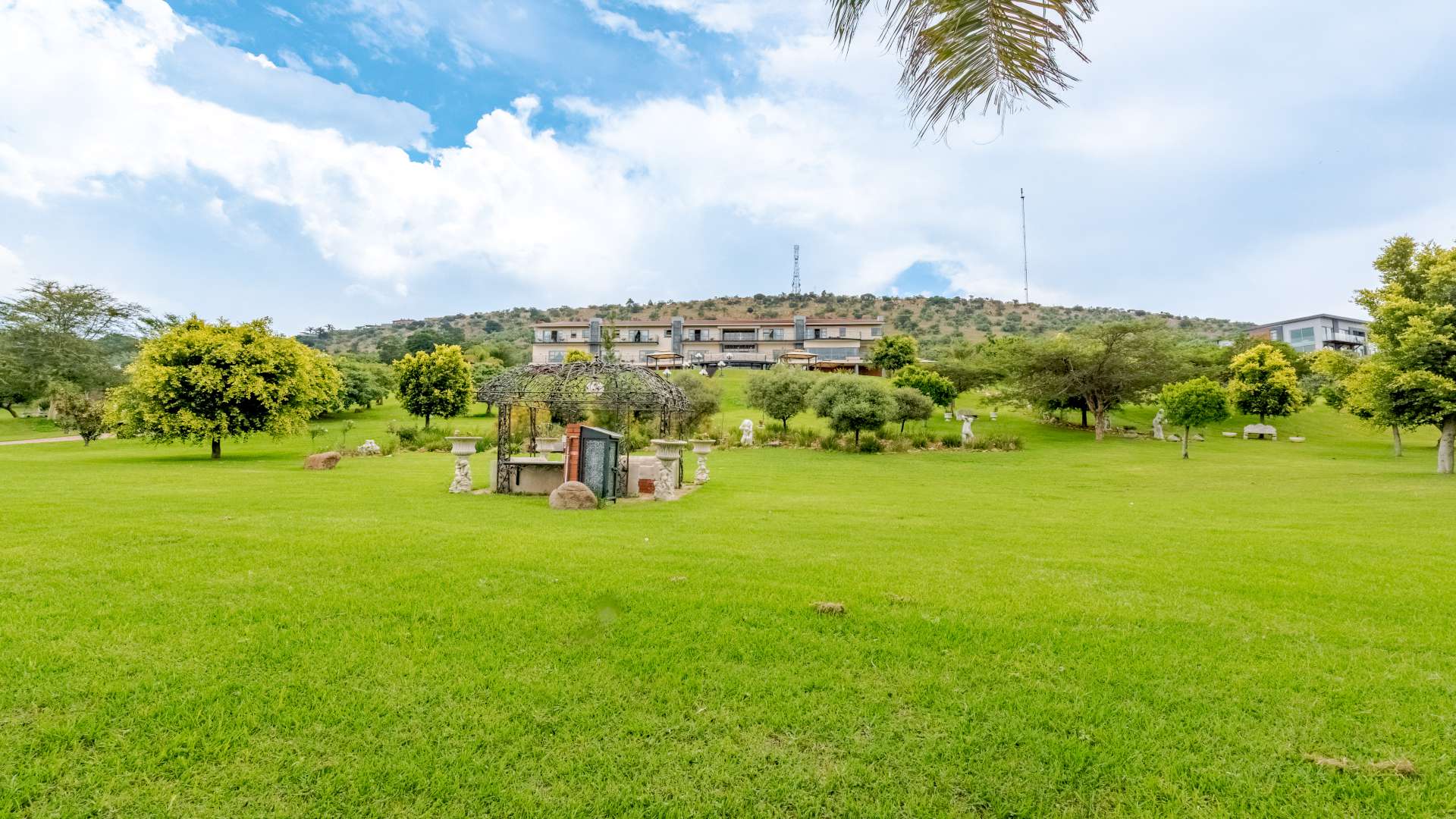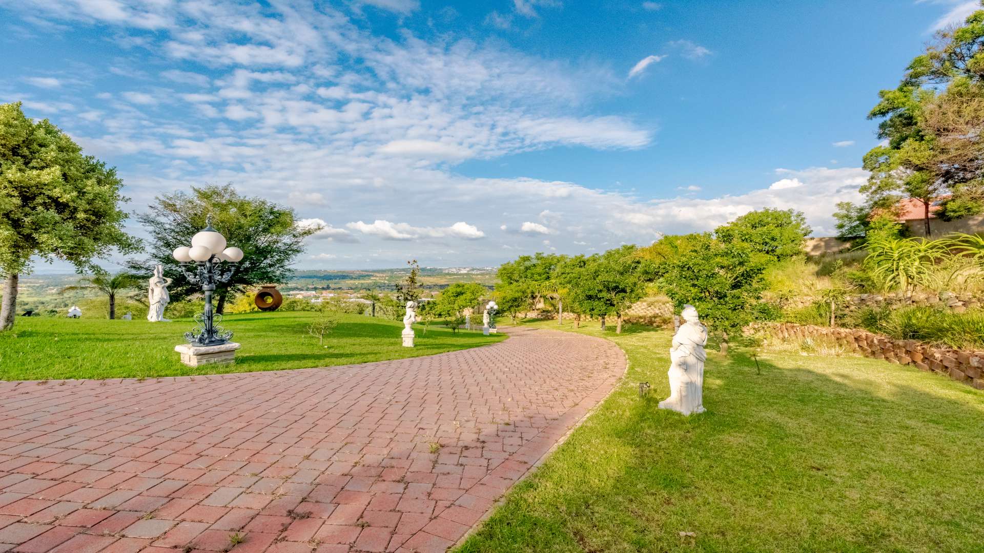 A bespoke wrought iron entrance, masterfully crafted, opens to a meandering, tree-lined driveway that gently ascends toward the residence, revealing glimpses of grandeur along the way.